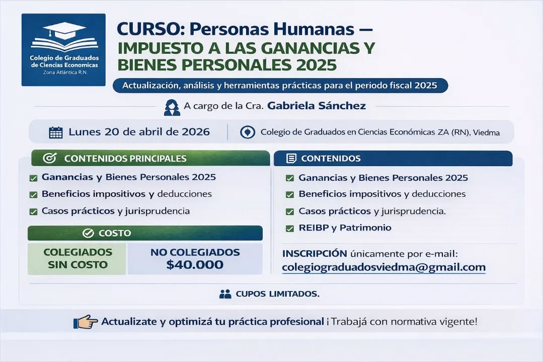 El Colegio de Graduados en Ciencias Económicas Zona Atlántica Río Negro invita a participar de esta propuesta de capacitación orientada a la actualización profesional para el período fiscal 2025.