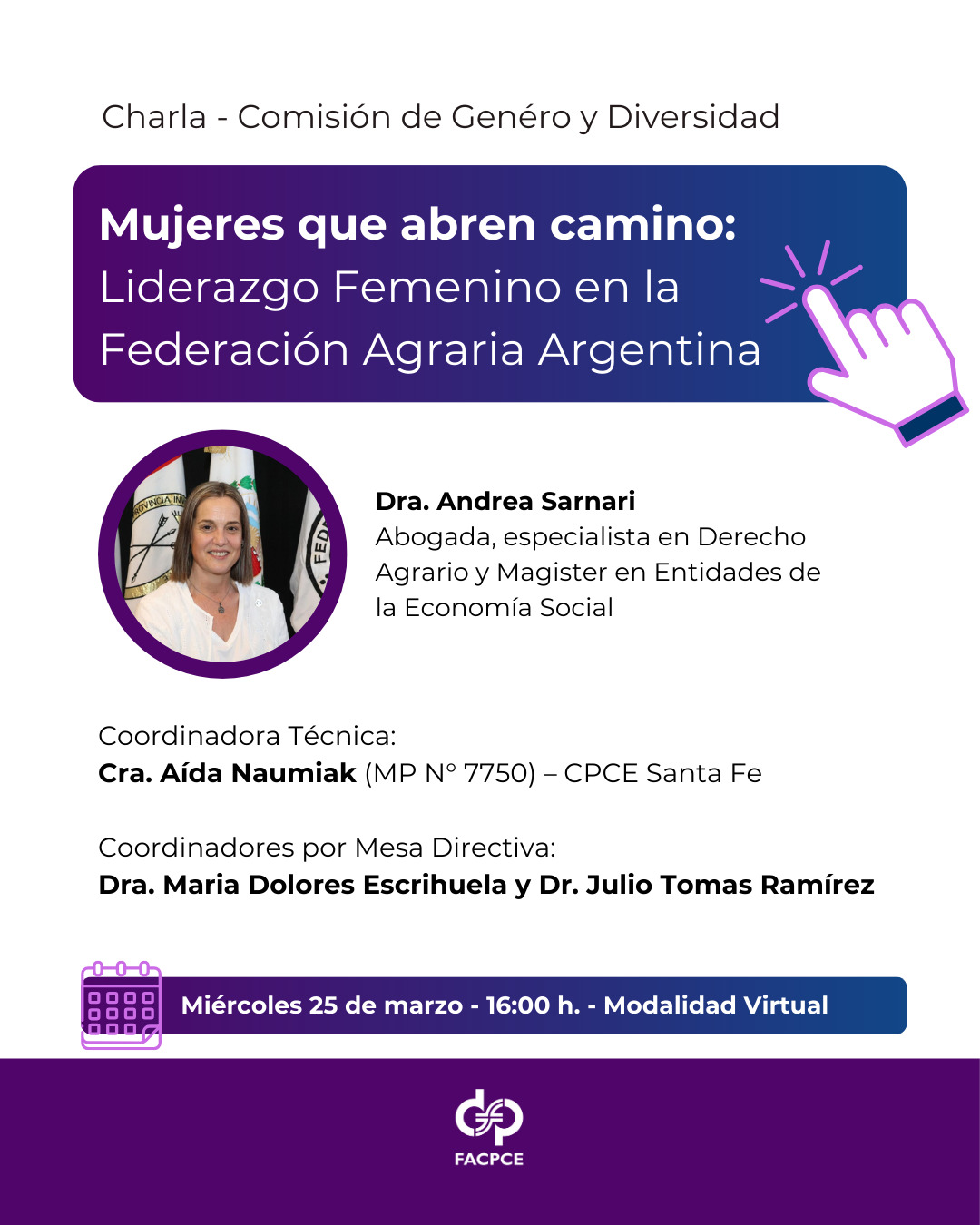 El miércoles 25 de marzo del cte., a las 16.00 hs., se brindará una charla sobre mujeres que abren camino: Liderazgo Femenino en la Federación Agraria Argentina, a través de Zoom.