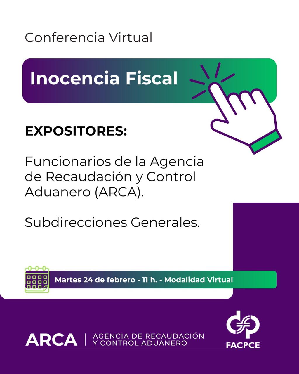 Estimados matriculados, el martes 24 de febrero a las 11:00 hs., se brindará una Conferencia virtual sobre “Inocencia Fiscal”, a través de la plataforma Zoom.