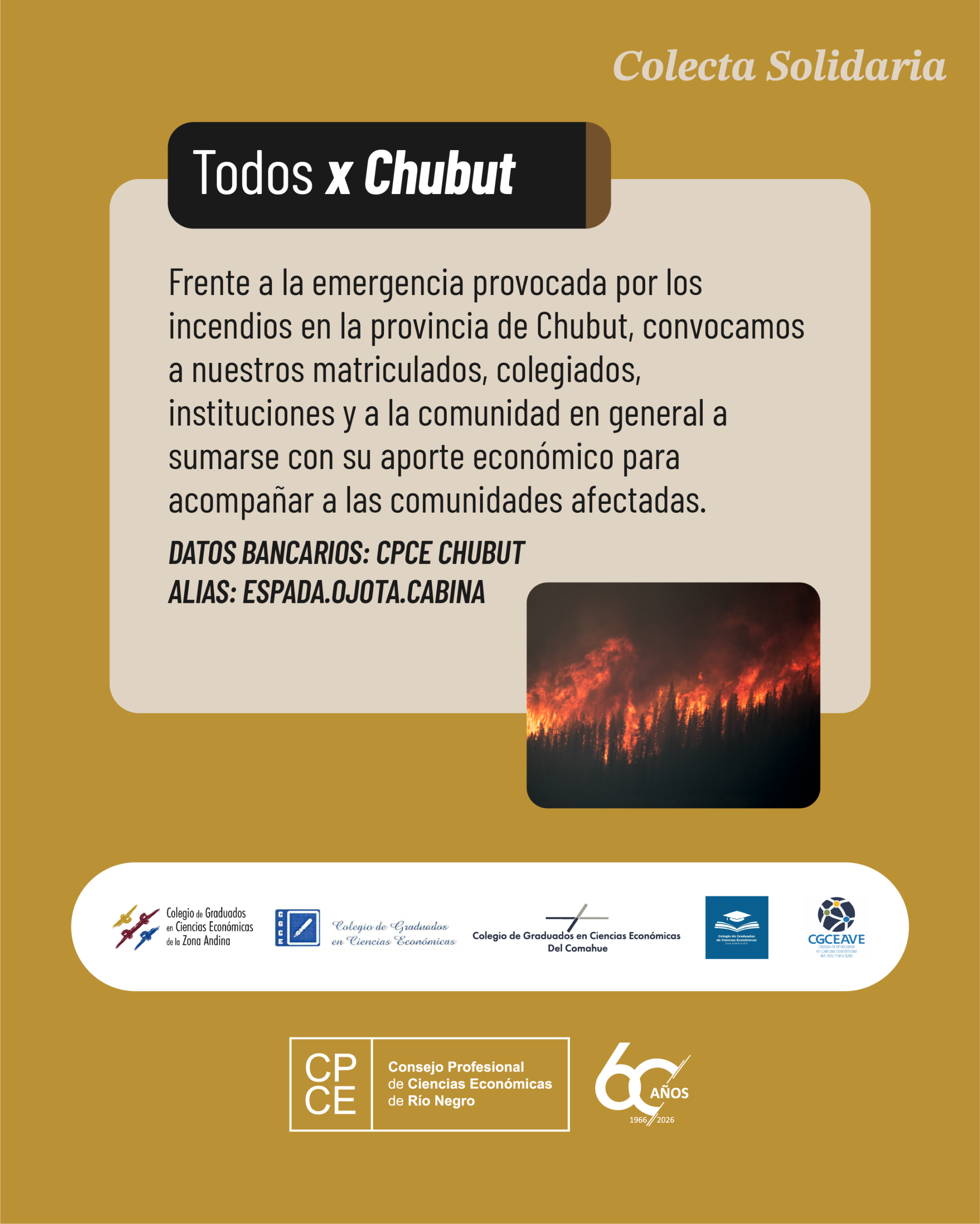 Frente a la emergencia provocada por los incendios en la provincia de Chubut, convocamos a nuestros matriculados, colegiados, instituciones y a la comunidad en general a sumarse con su aporte económico para acompañar a las comunidades afectadas .